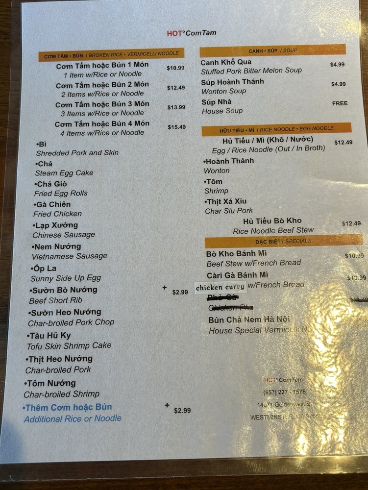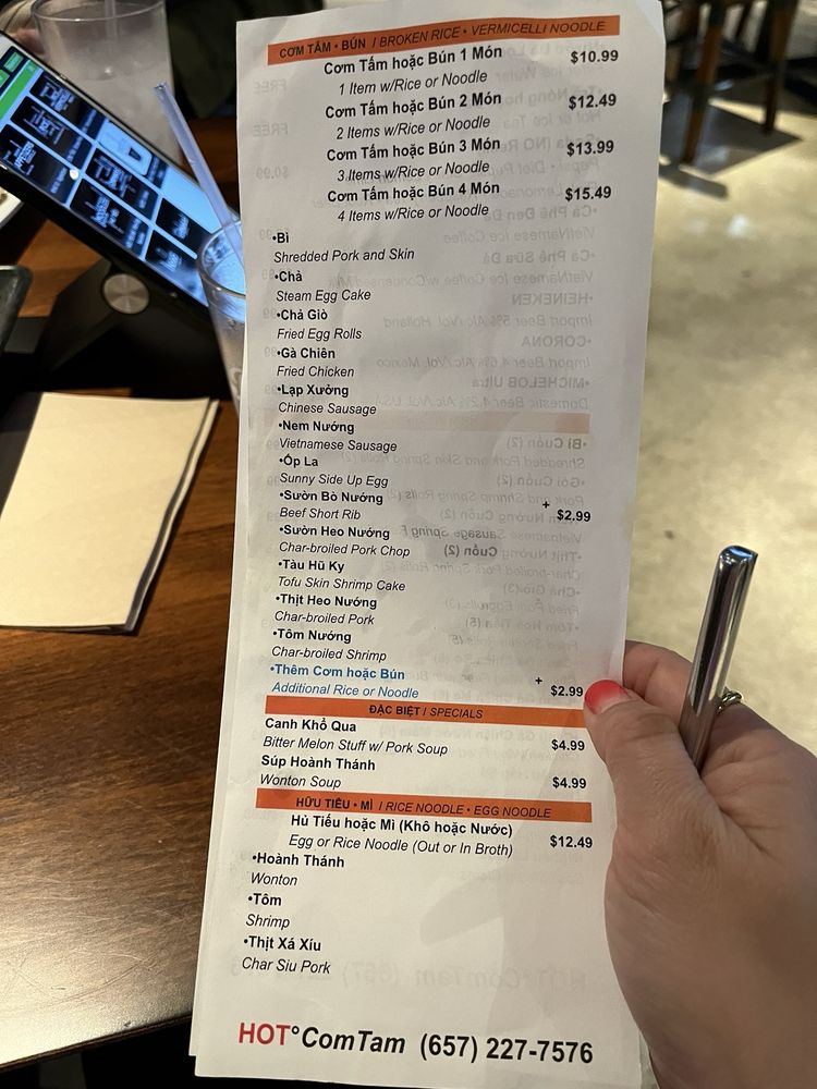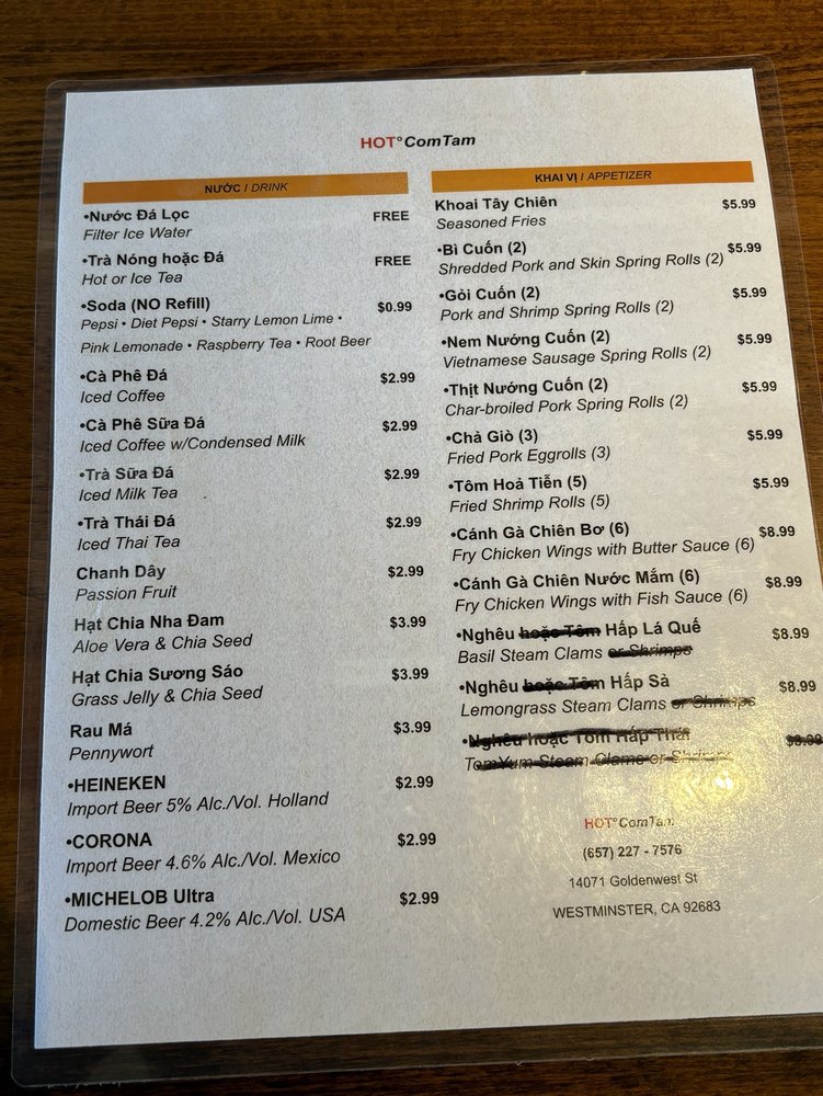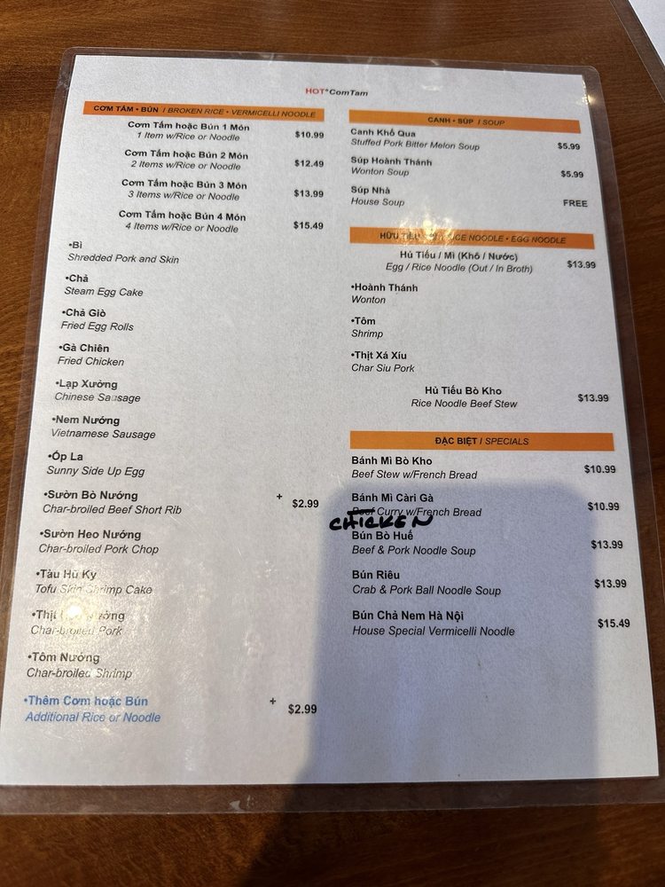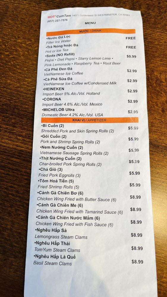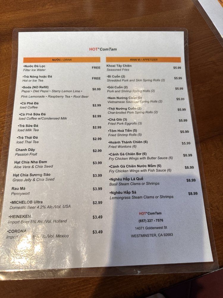 HOT Com Tam, located in Westminster, CA, is a must-try for Vietnamese broken rice enthusiasts. Offering a variety of options like Shredded Pork, Fried Egg Rolls, and Charbroiled Pork Chop, the menu truly lives up to its famous claim. The reasonable prices, friendly service, and tasty food make it a standout spot. Reviews praise the ample portions, friendly staff, and convenient tablet ordering system. With options for seafood lovers and casual dining, HOT Com Tam is a great choice for groups or solo diners. Don't miss out on the steamed basil clams, a customer favorite! Experience the flavors of Vietnamese cuisine without breaking the bank at HOT Com Tam.