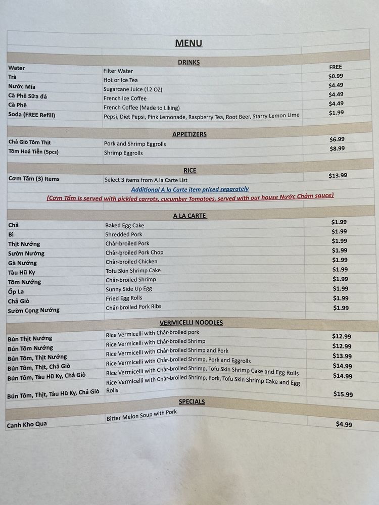 Choose between broken rice or vermicelli noodle. Select one topping: beef short rib, char-broiled pork chop, shredded pork and skin, char-broiled pork, fried chicken, steam egg cake, fried egg rolls, Chinese sausage, Vietnamese sausage, sunny side up egg, tofu skin shrimp cake.